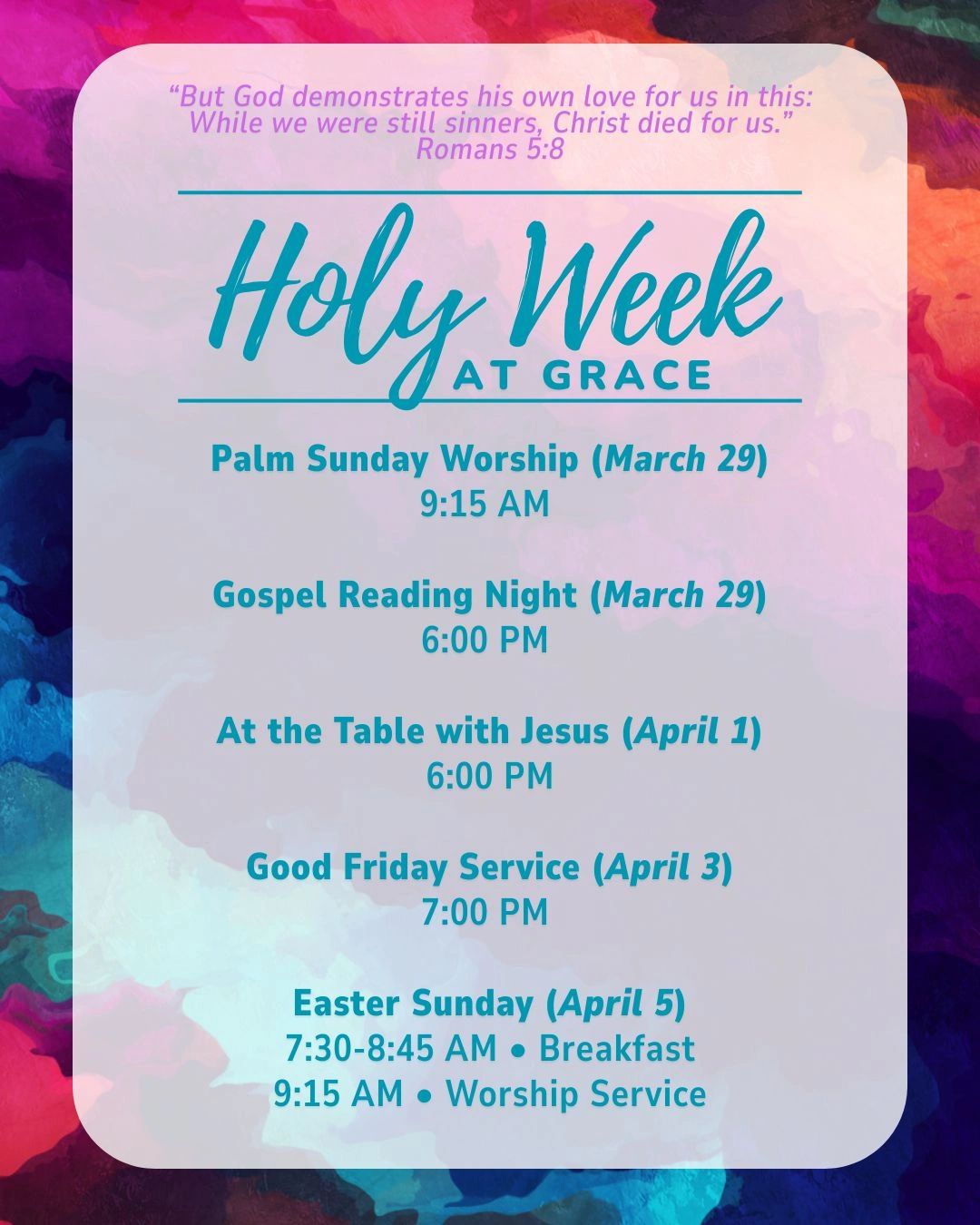 Throughout Holy Week, there are several opportunities for you to encounter the Lord and celebrate our risen Savior at Grace! Consider this your personal invitation to join us!